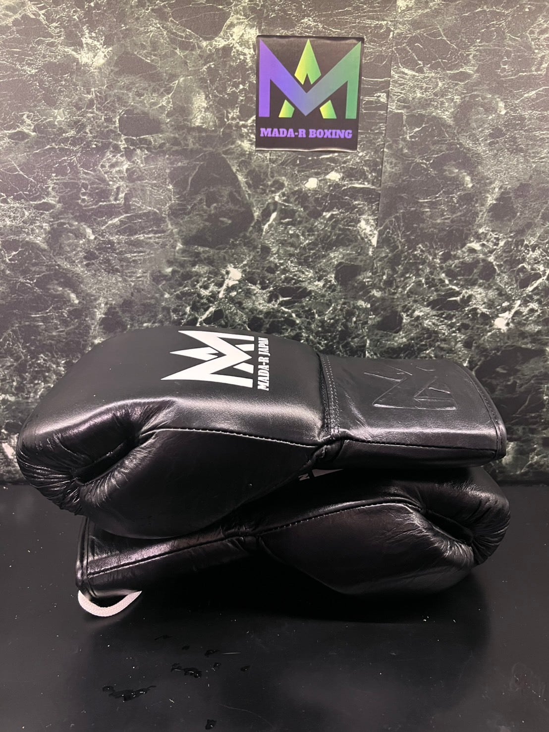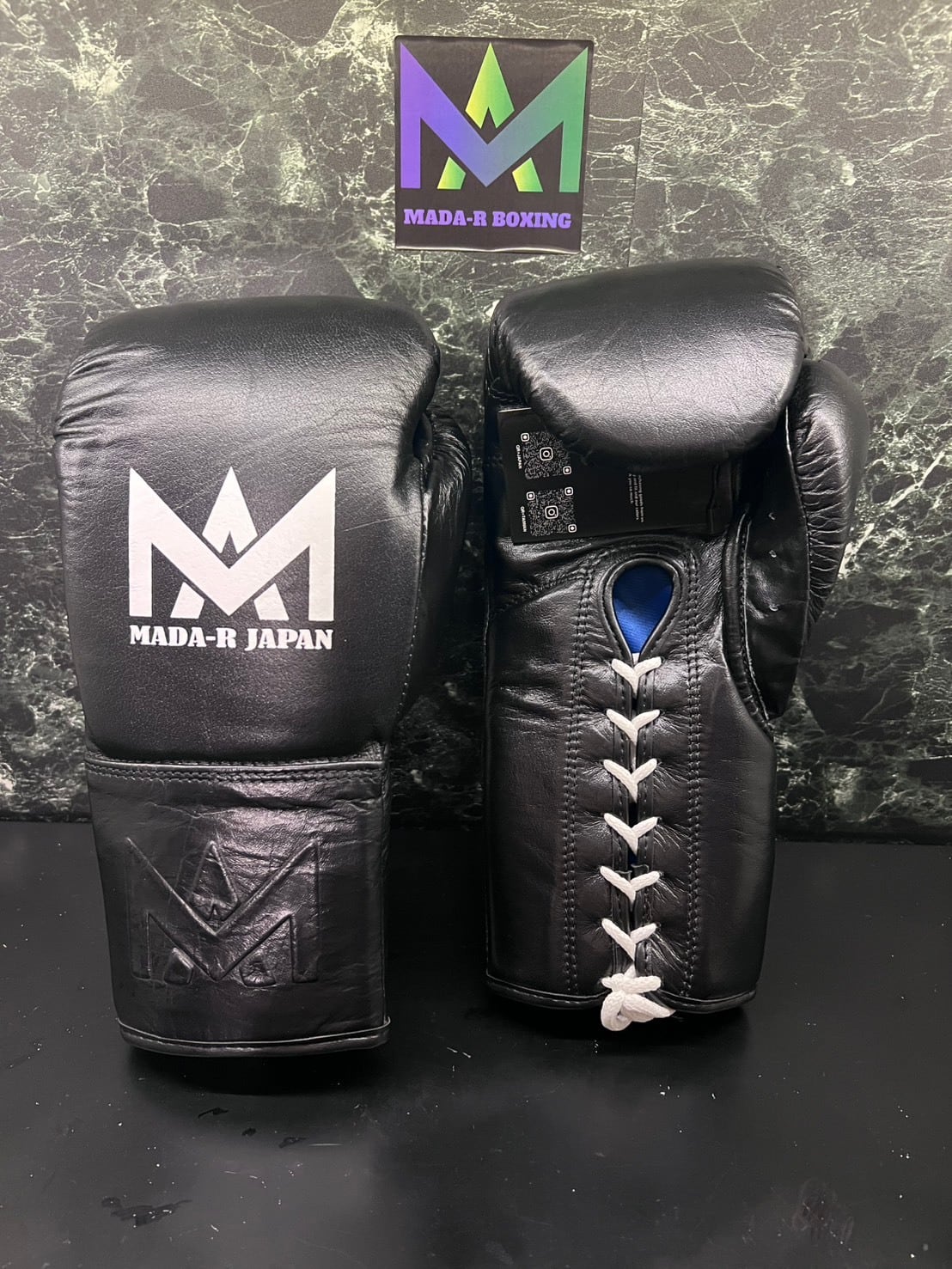 試合用モデル ヒモ式グローブ ブラック(ロゴ ホワイト) 8oz 10oz | MADA-R & ARCADE JAPAN